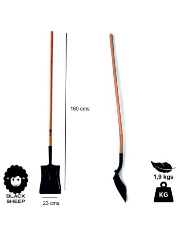 Dies ist die schwarze Schafsschaufel. Profilierte Kohlenstoffstahlschaufel und lackiert in Schwarz, mit einem spezifischen geschwungenen Holzgriff für den Bau von Pensionen, Sprüngen und Arrangements auf MTB-Wegen, Wanderzentren, Schmutzwege und Radparks. Leichte, ergonomische und leichte Schaufel für Wanderbauer.